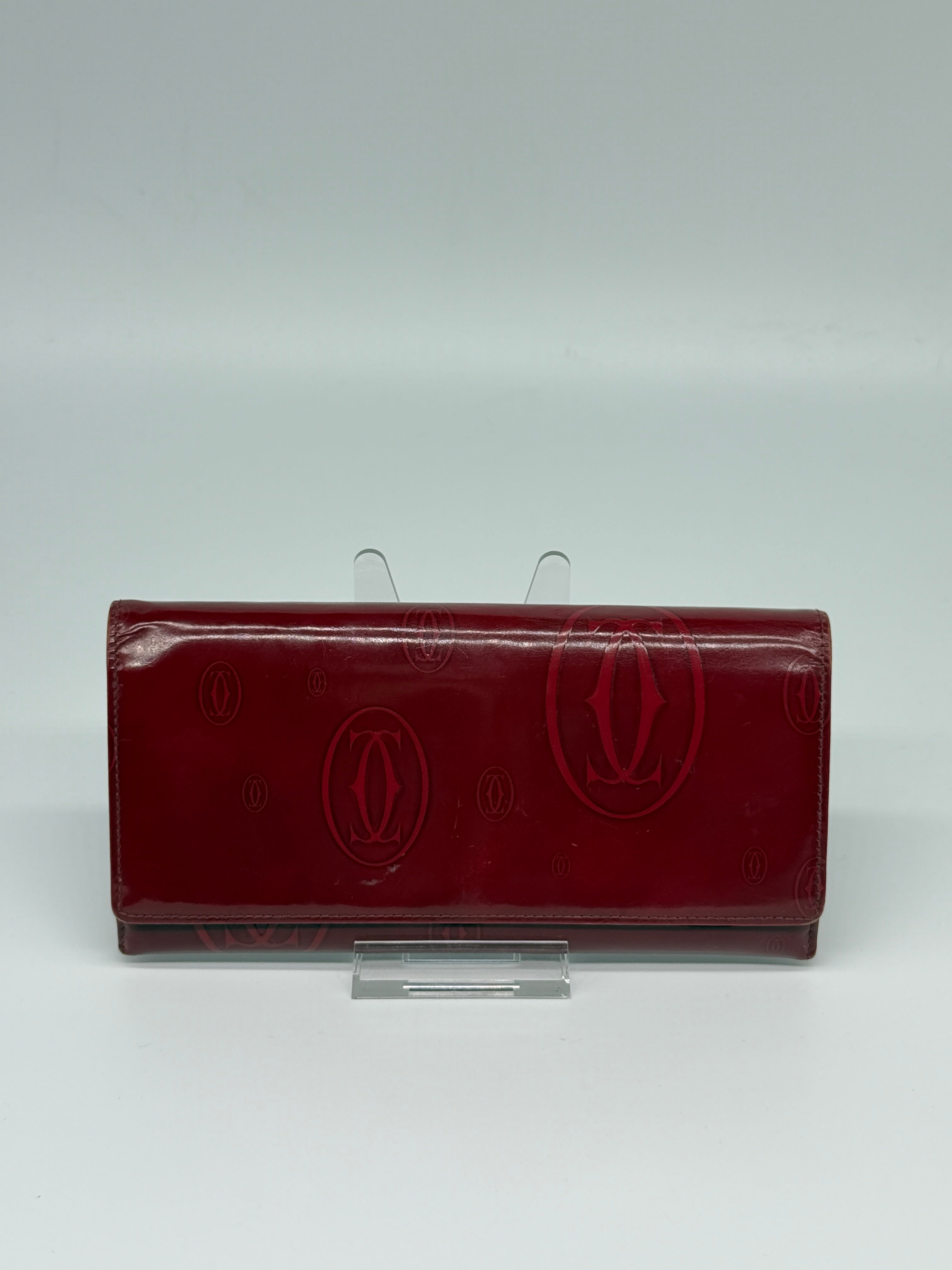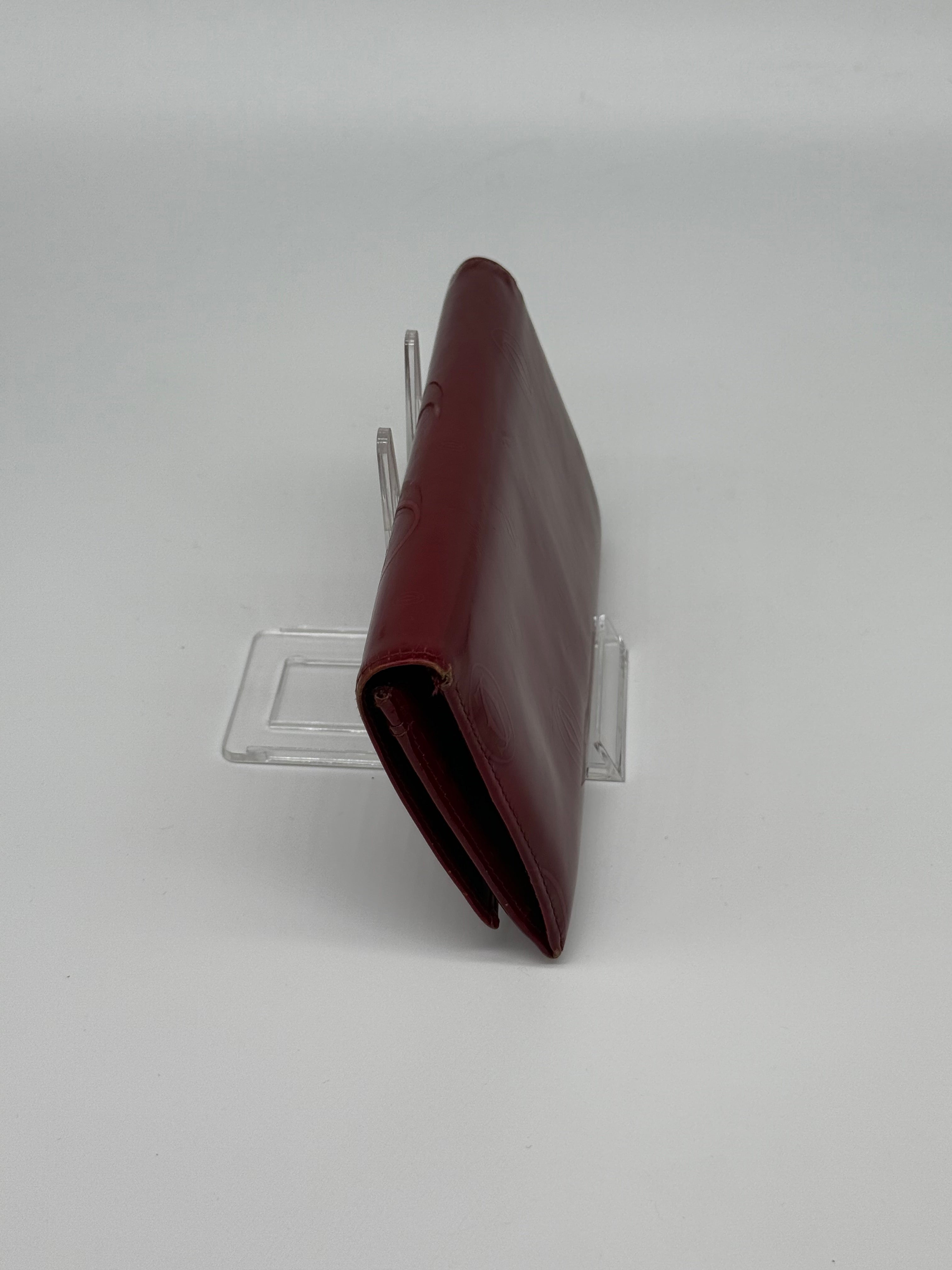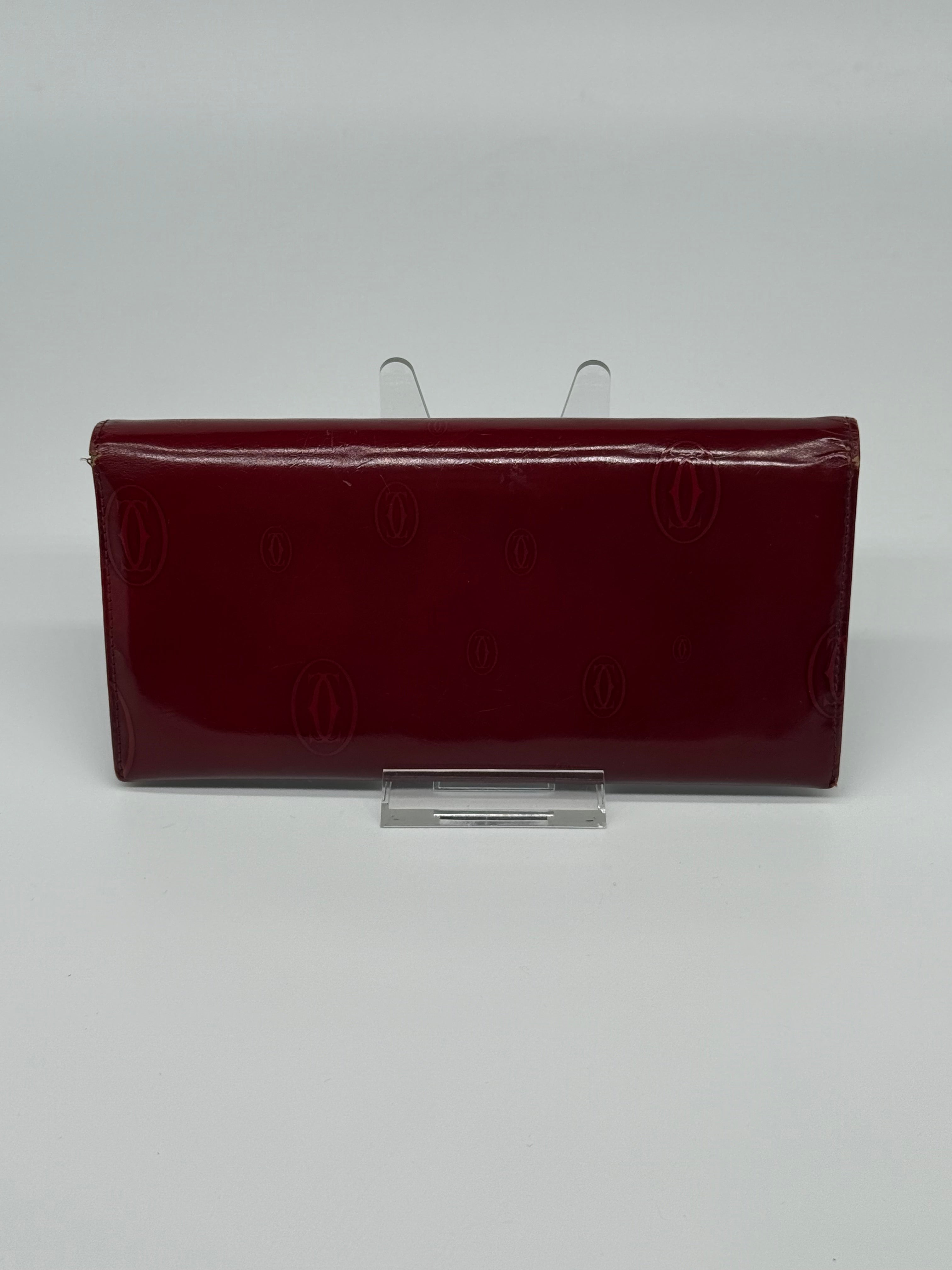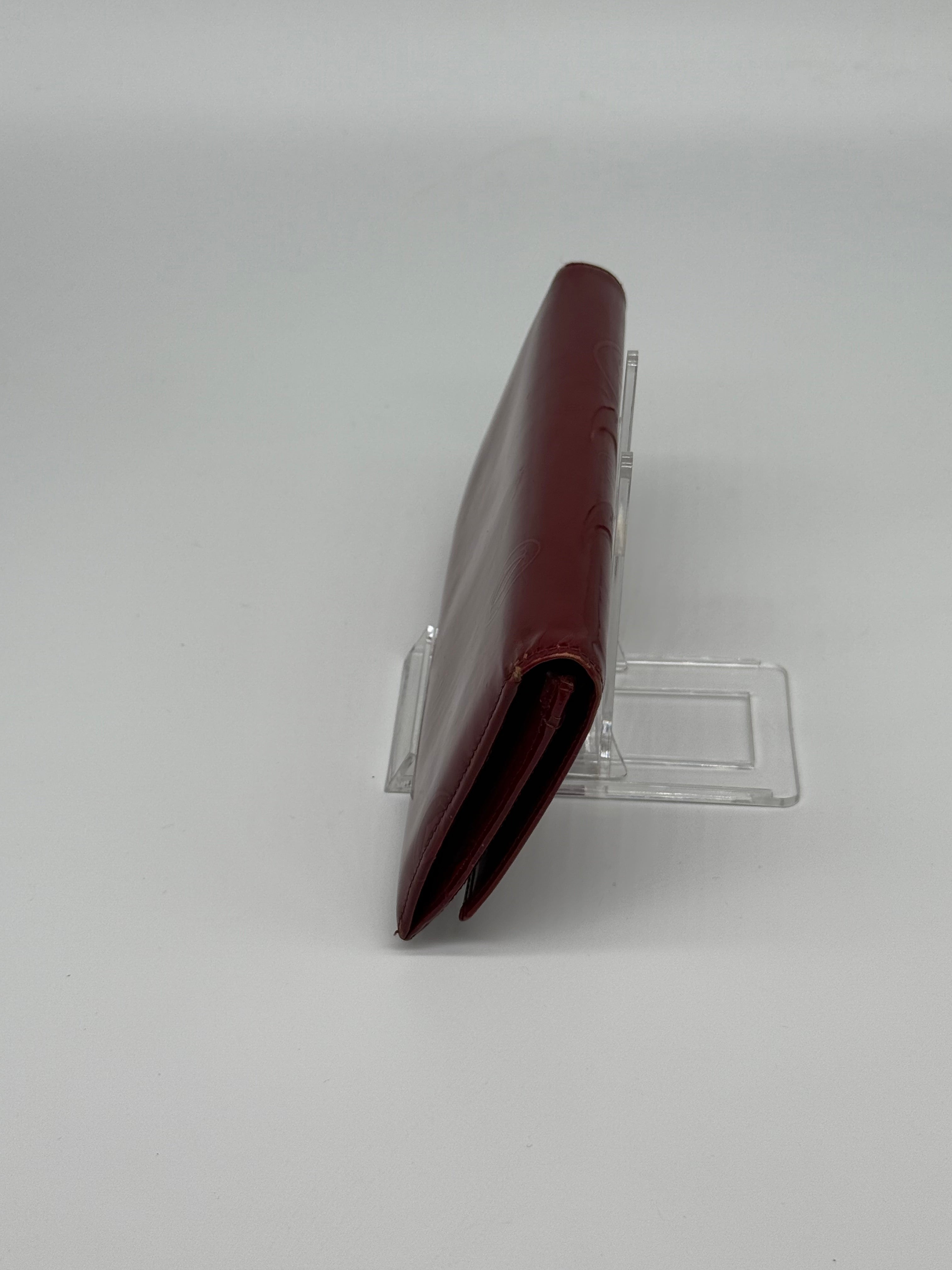 Spacious wallet featuring Bordeaux Enamel Leather exterior with Iconic Cartier logo all-over, a perfectly functional snap. Interior features 6 card slots, 3 bill slots, 1 oversized open compartment and 1 zippered compartment. Silver hardware including Cartier zipper pull. Absolute showstopper!