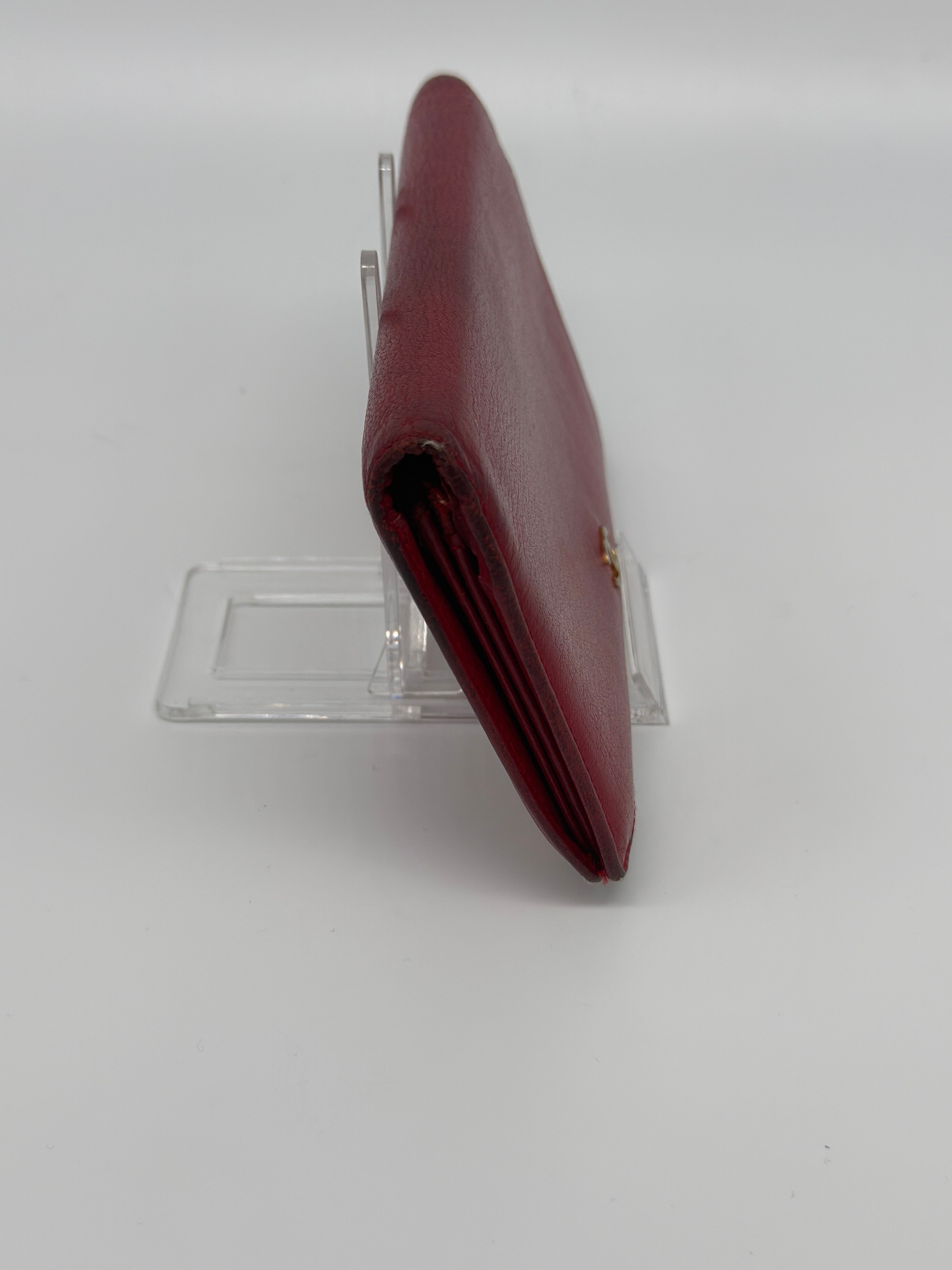 Callouts: tarnishing of exterior hardware, slight corner/edgewear, flyaway threads in card slot (typical with this particular wallet, does not affect functionality), leather rub in interior, leather puckering in interior, coin residue in interior zippered compartment, missing zipper pull on interior zippered compartment, wear to cloth inteior in bill compartments. Small imperfections that do not affect the functionality or beauty of this wallet! Please see all pics/video! Please note that side views appear burgundy. Wallet is RED!