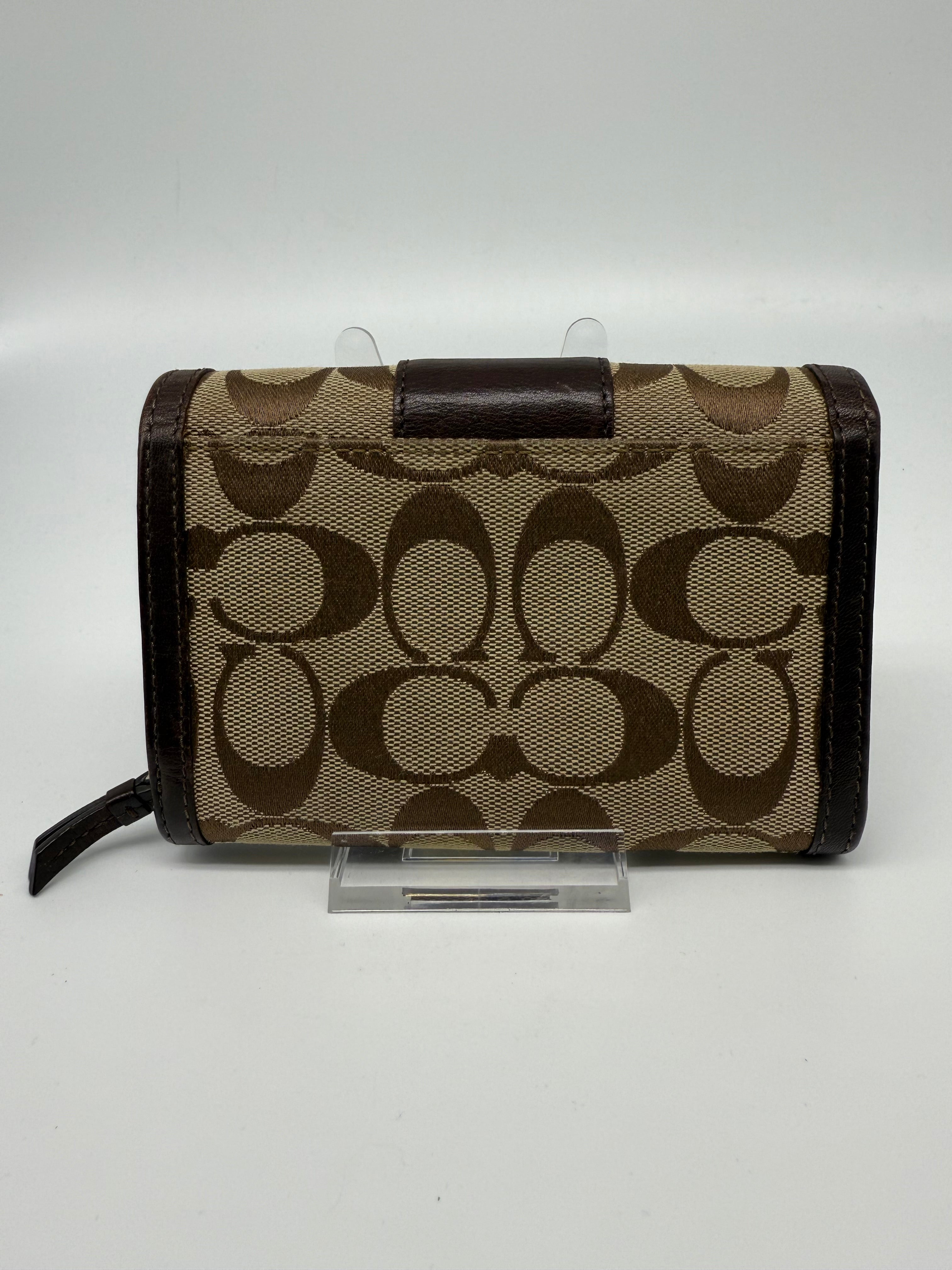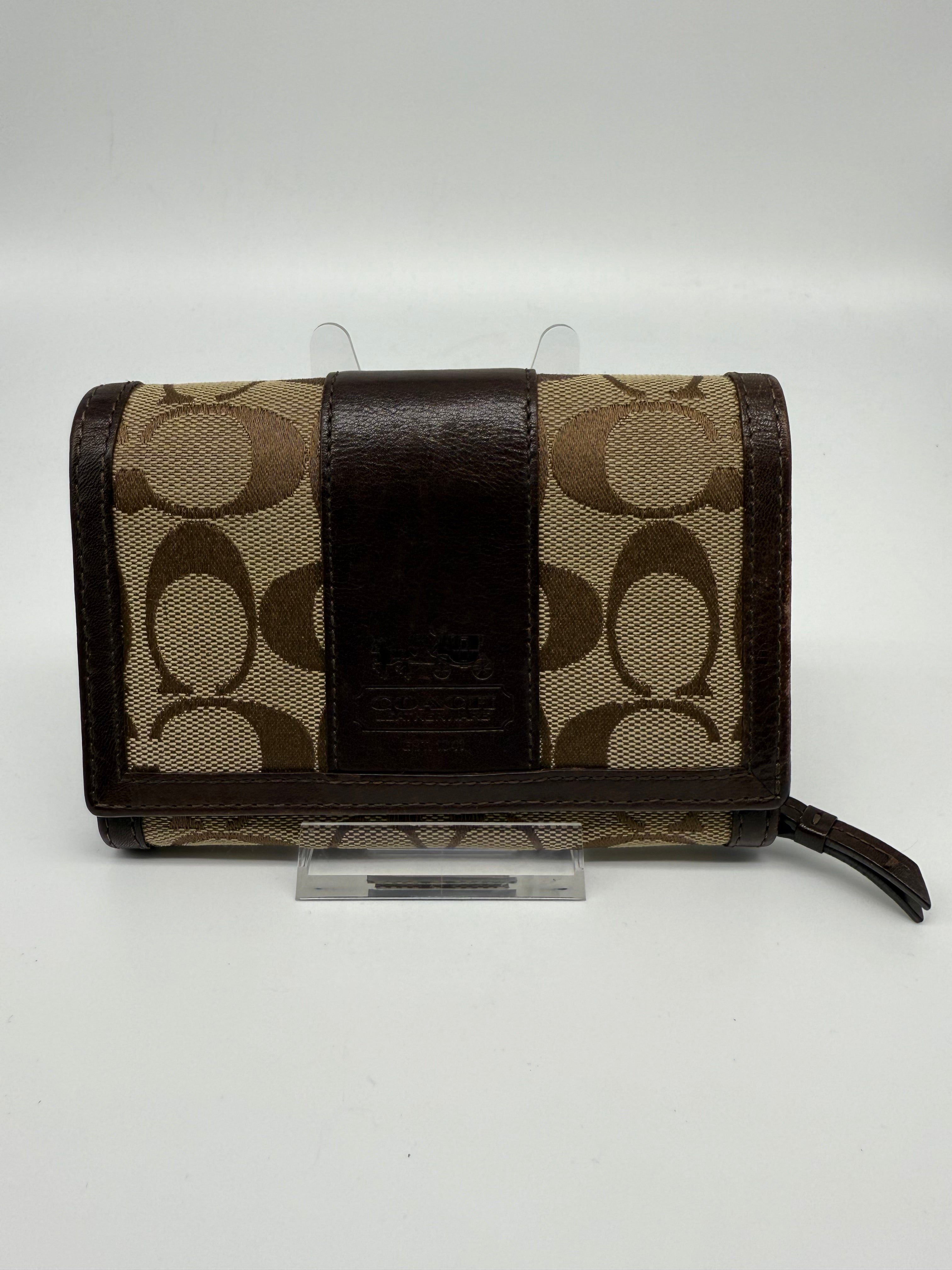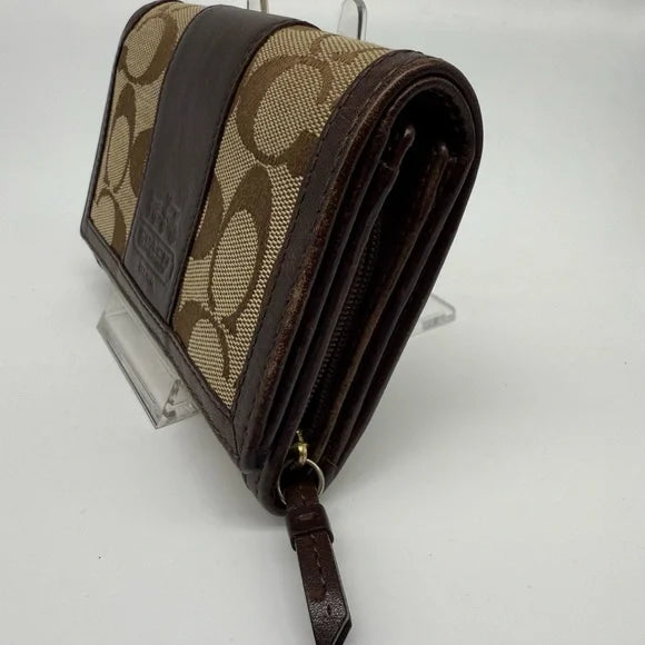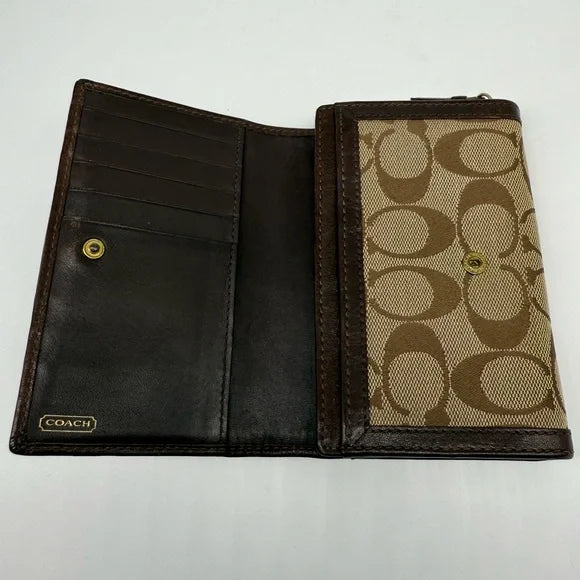 Exterior features iconic canvas Signature Monogram, leather appointments and trim, engraved Coach logo and back card slot. Interior features 4 card slots, 4 folded bill compartments, 1 large compartment, a zippered compartment with 2 large compartments inside. Beautiful leather interior in excellent condition. Zippers work great!