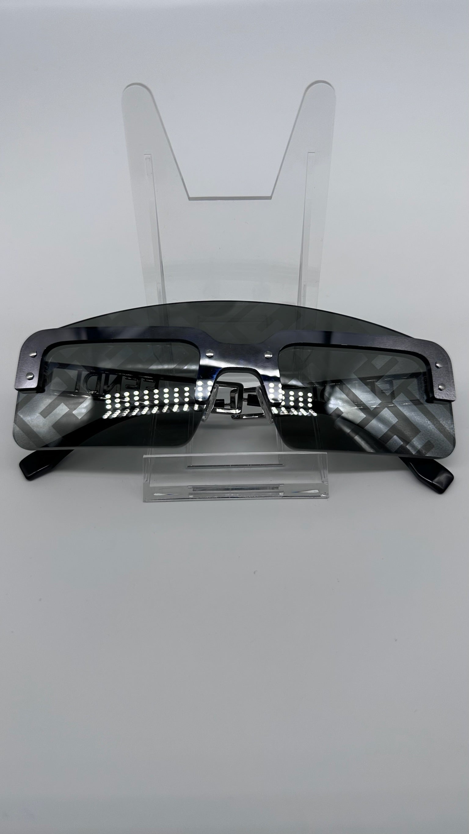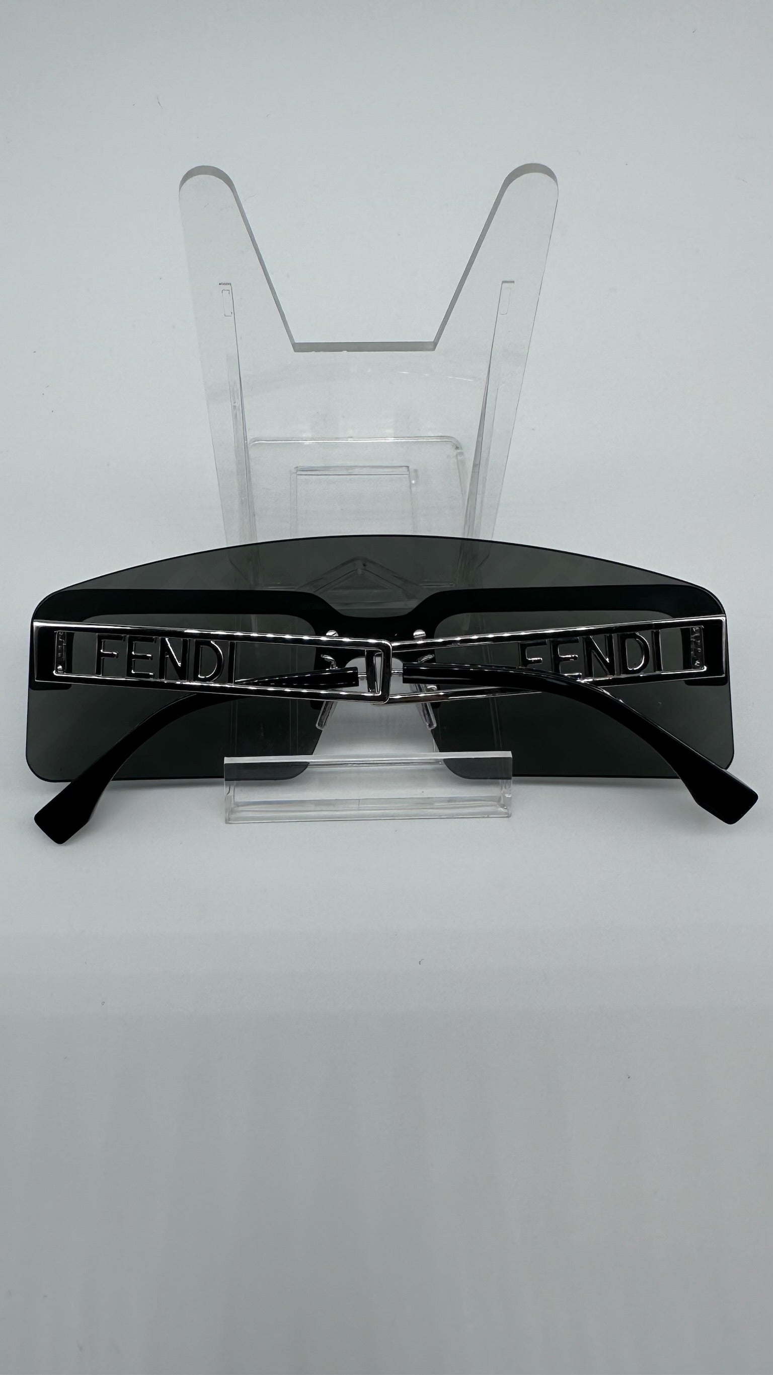Bold and futuristic, these Fendi Technicolor Shield Sunglasses feature a smoke mirrored lens etched with the iconic Fendi monogram and oversized rimless silhouette.