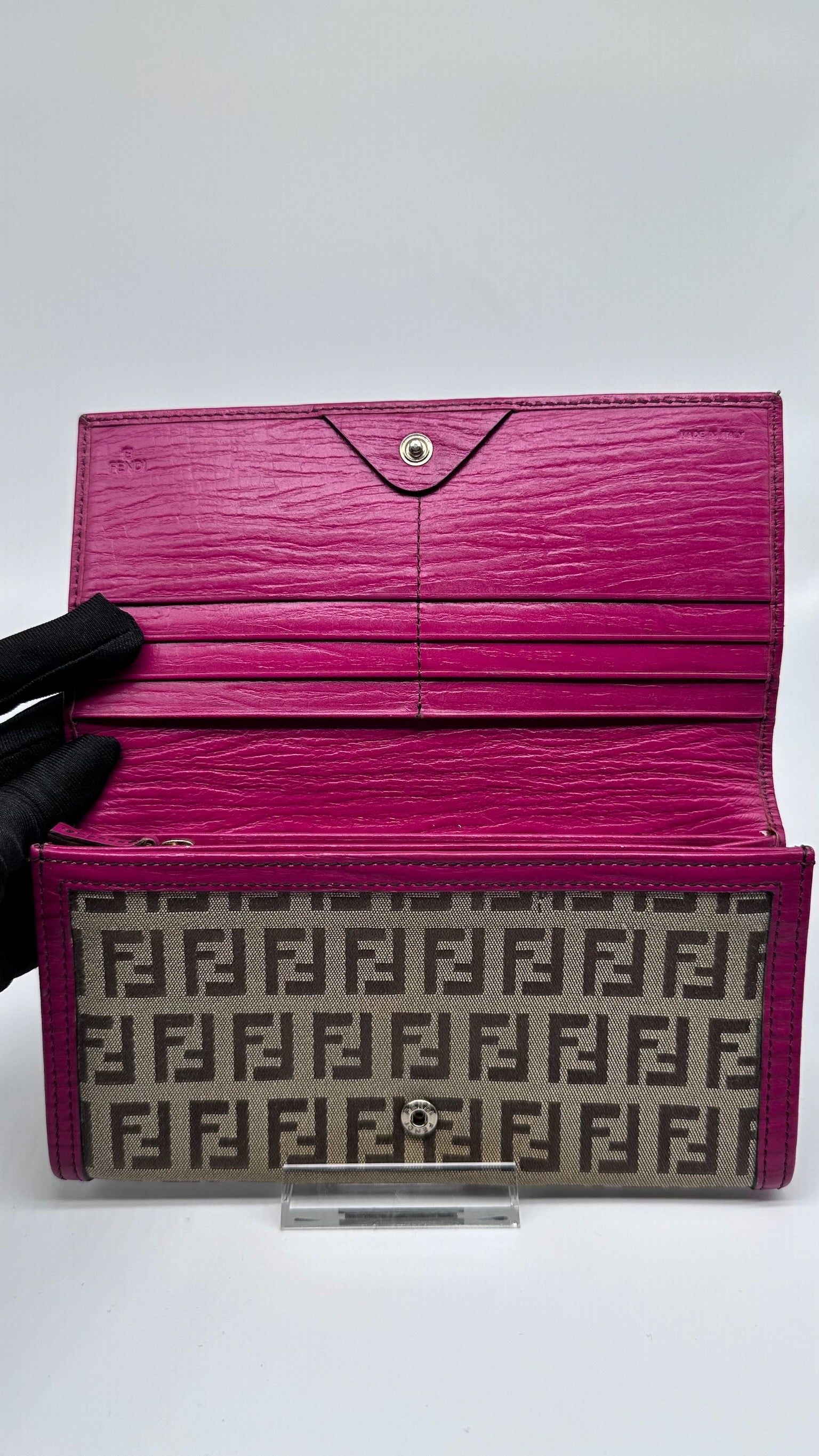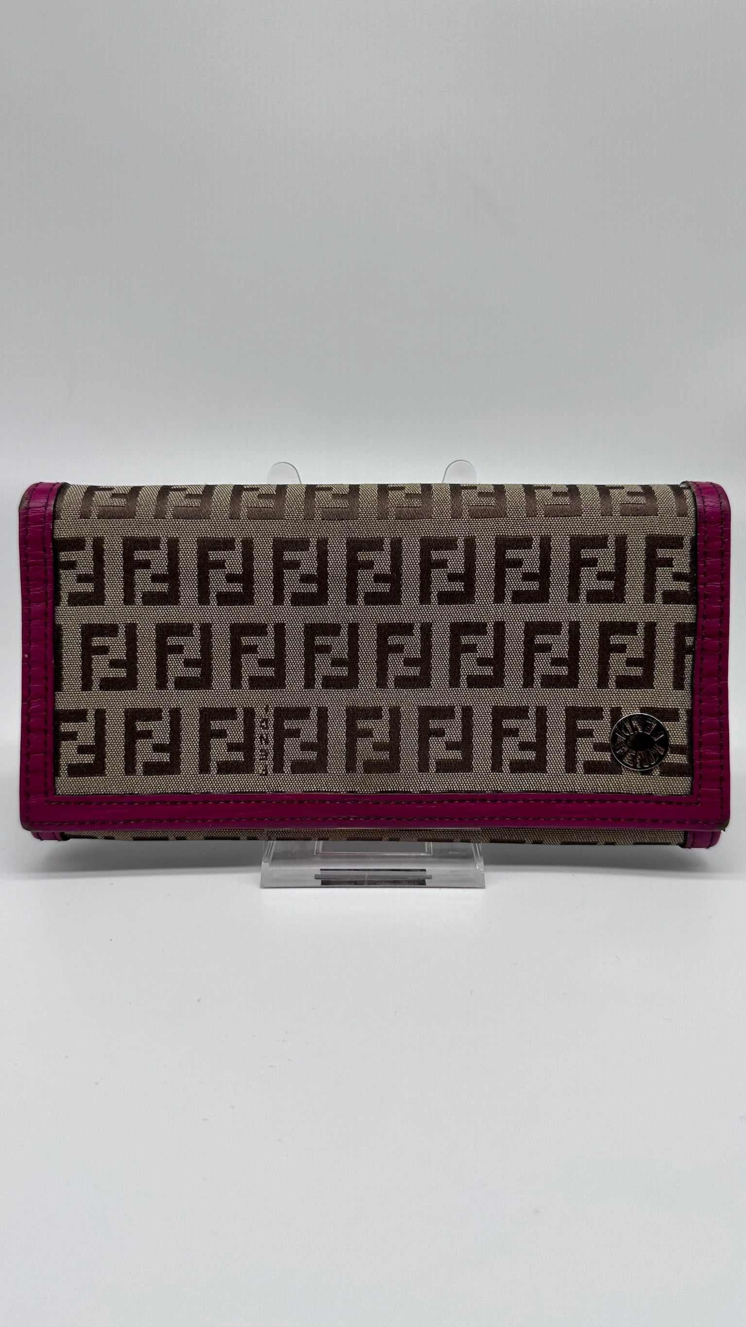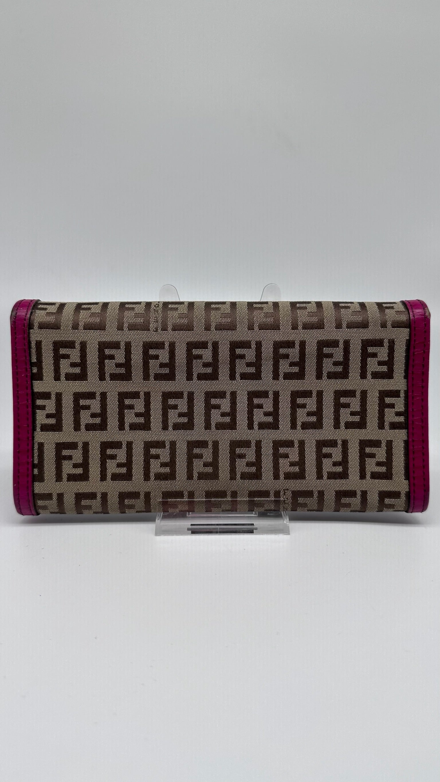 Authentic RARE Fendi continental wallet featuring the iconic FF Zucca monogram canvas and striking magenta/hot pink leather trim.