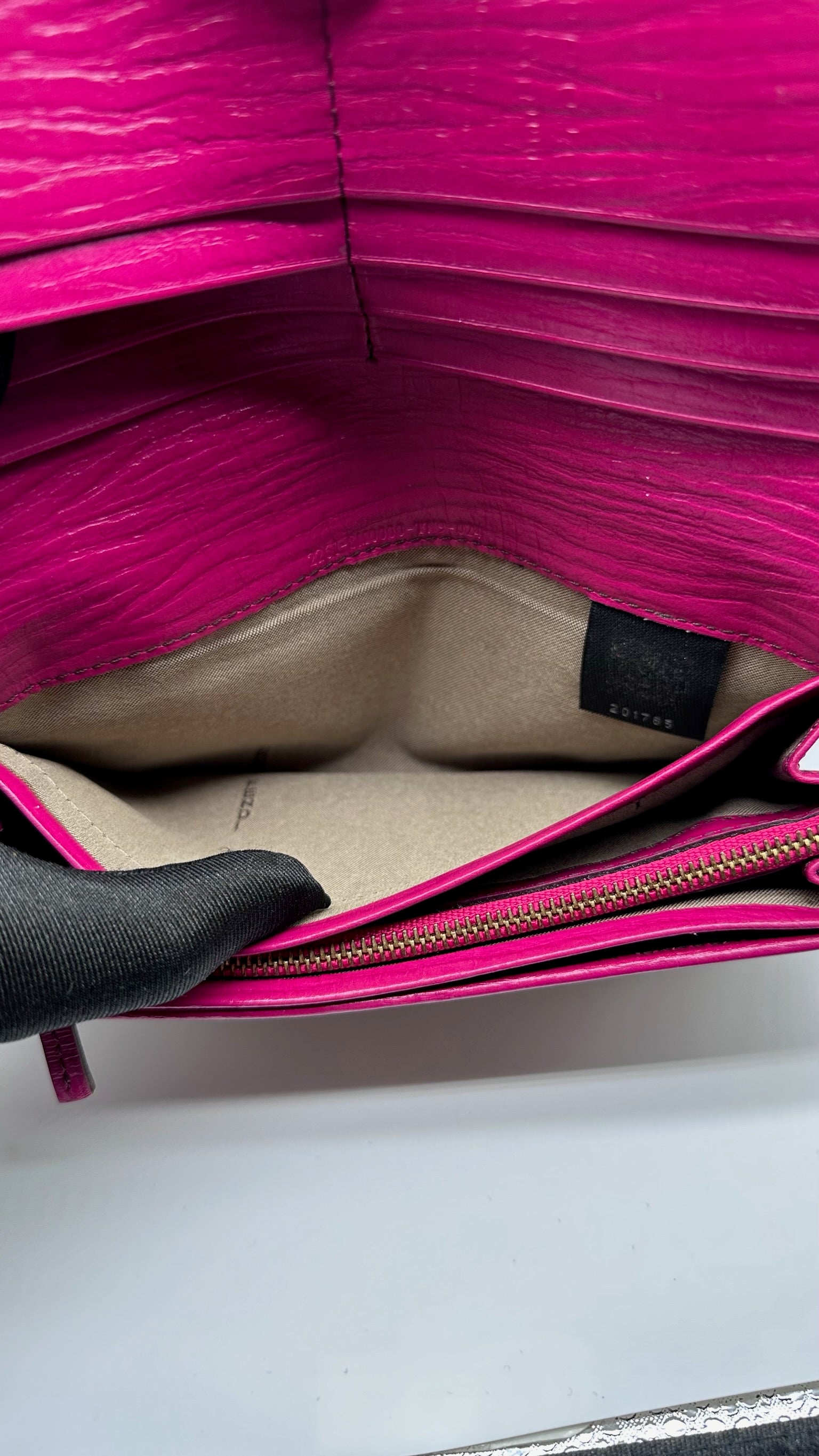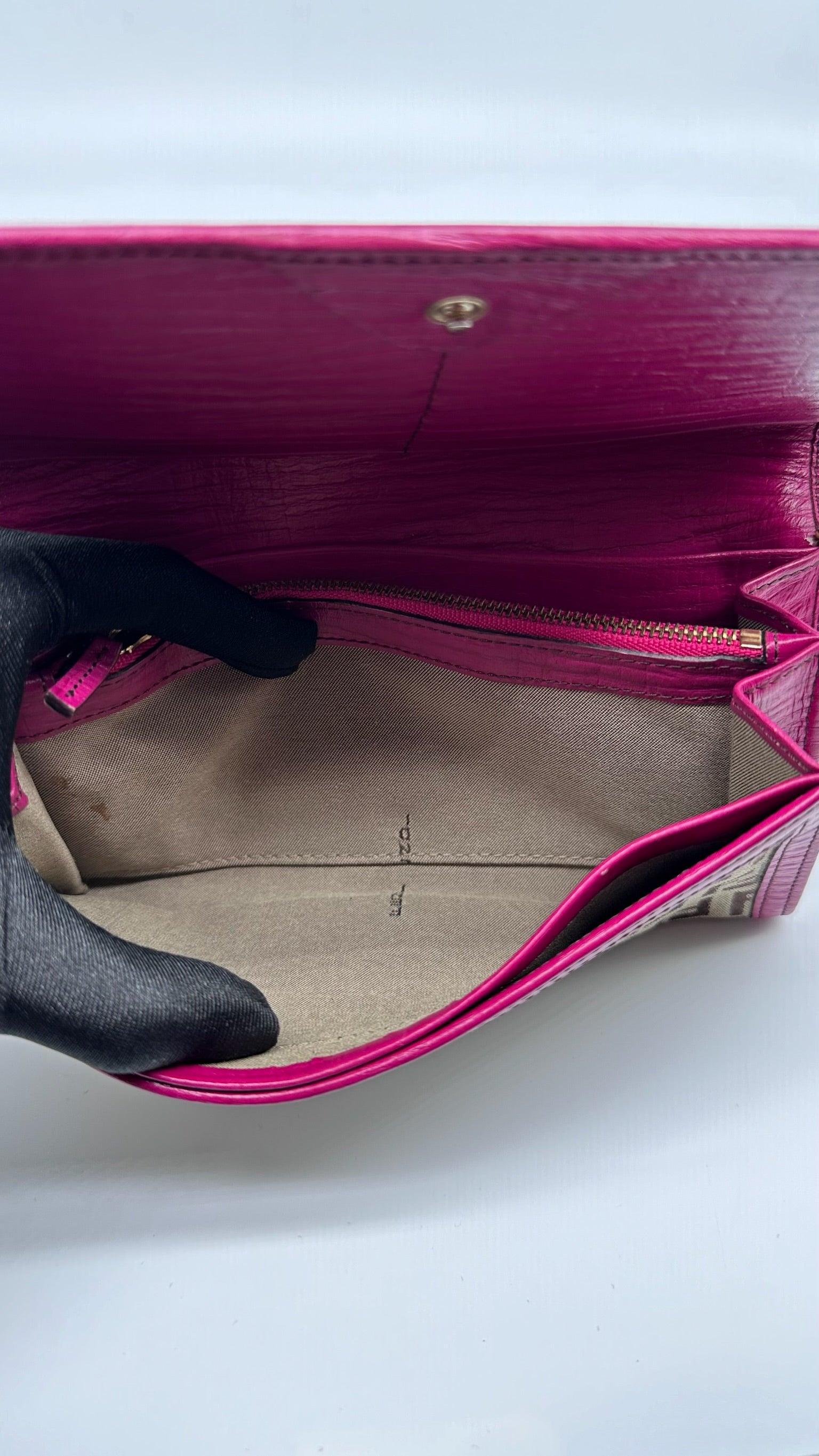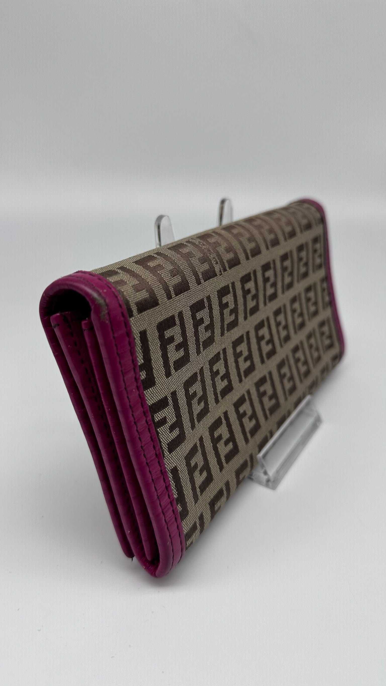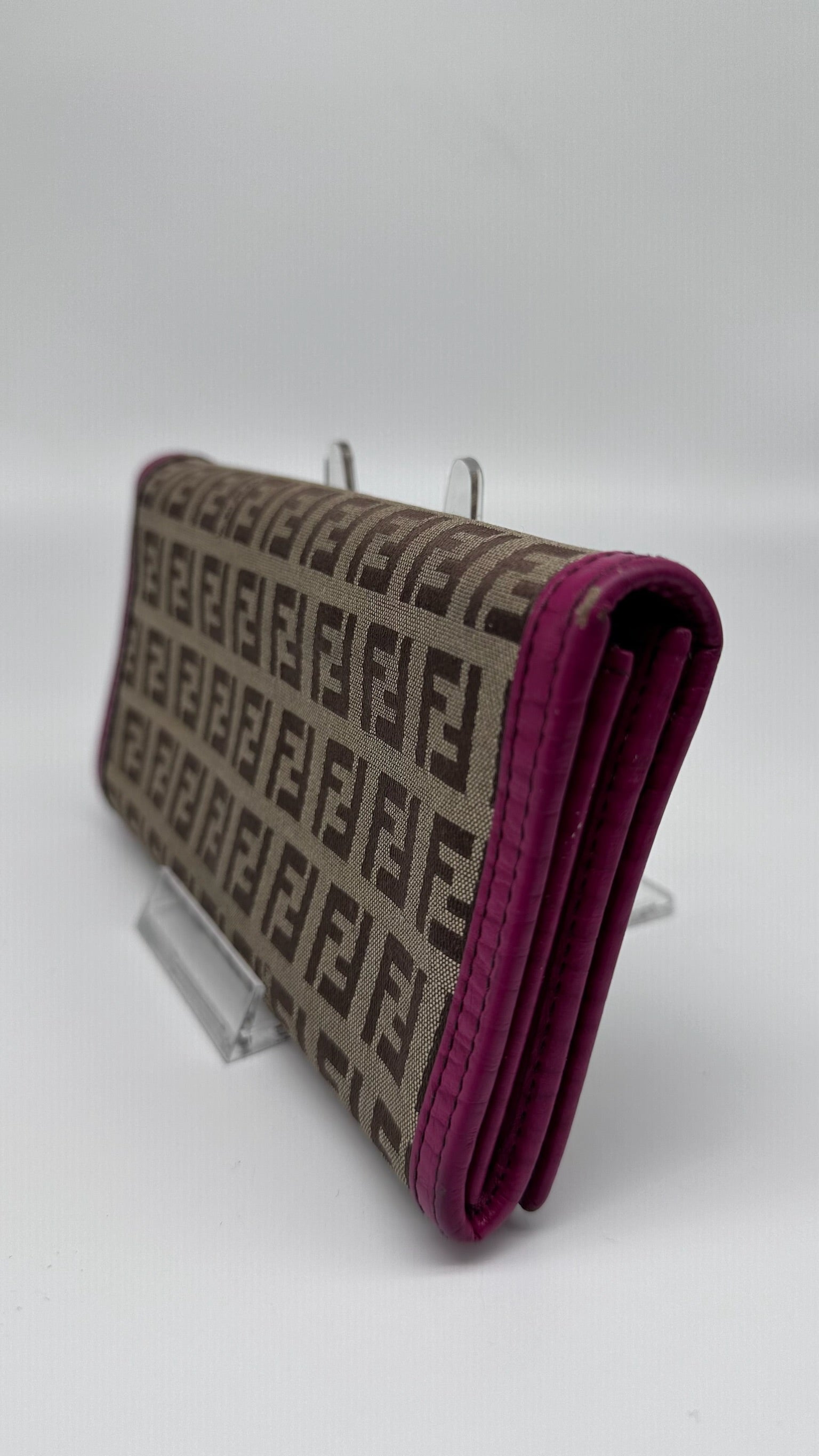 Authentic RARE Fendi continental wallet featuring the iconic FF Zucca monogram canvas and striking magenta/hot pink leather trim.