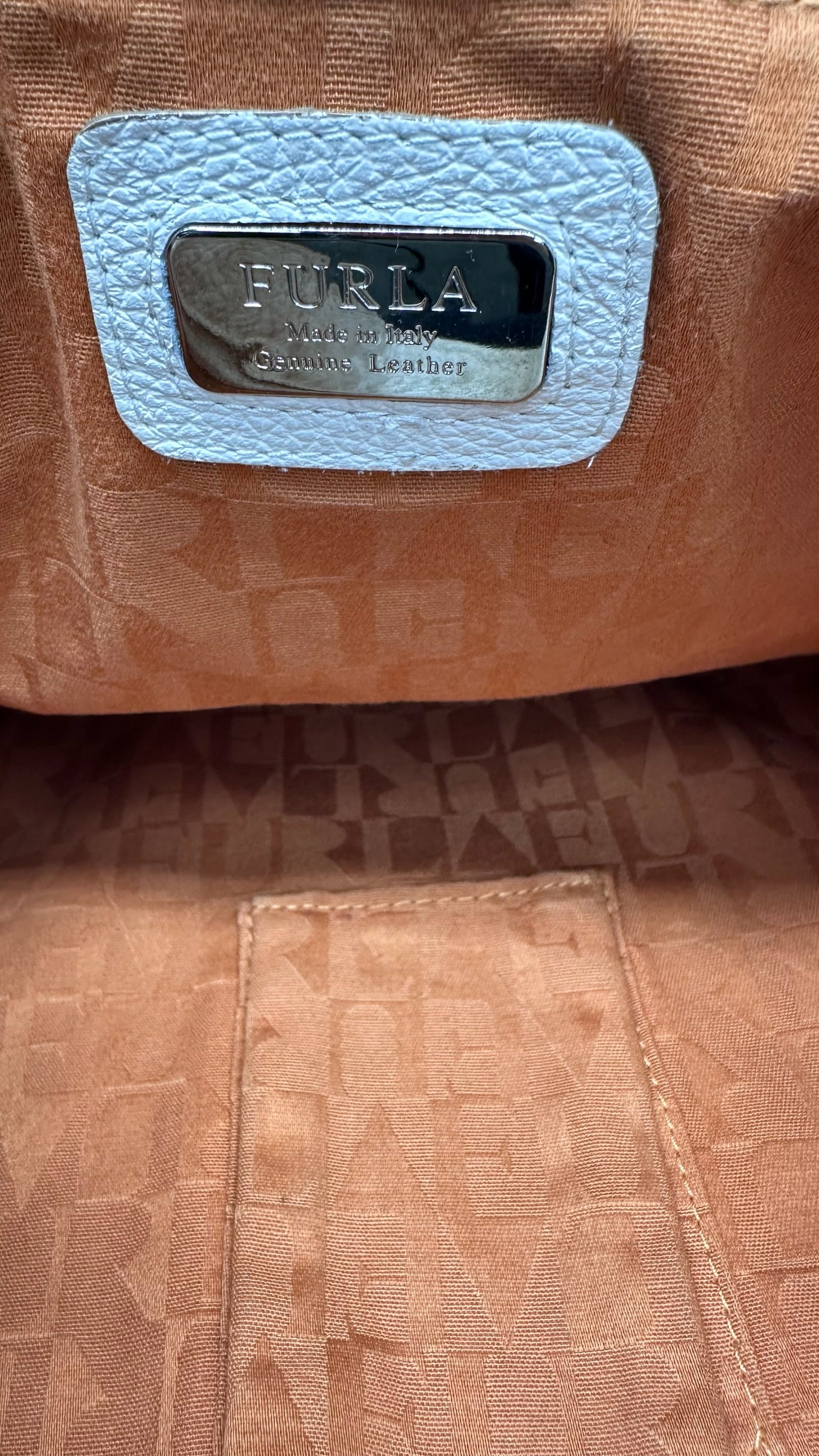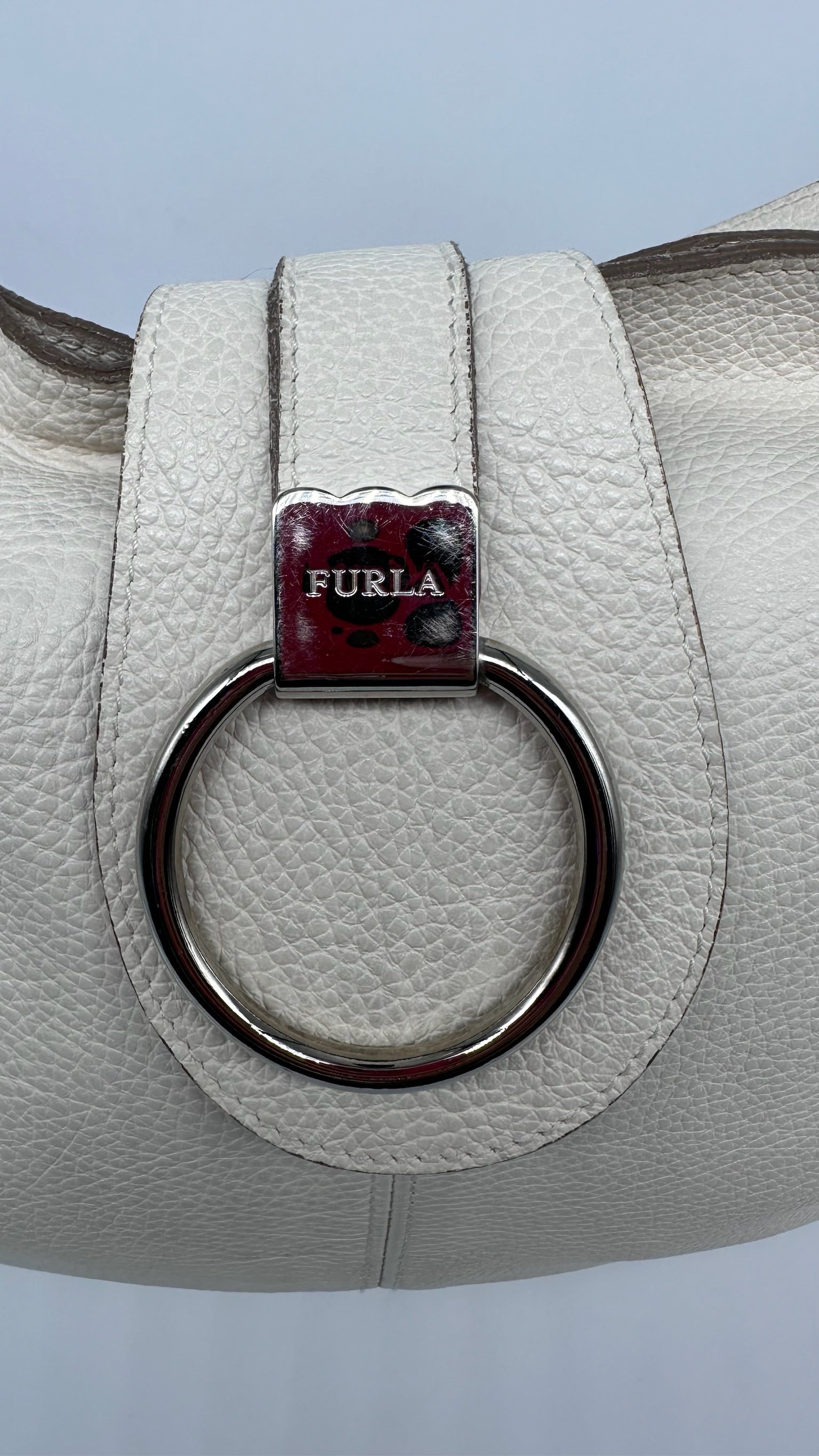 Genuine leather Furla hobo bag in a chic off-white/cream tone with pebbled texture and oversized silver-tone metal ring hardware.