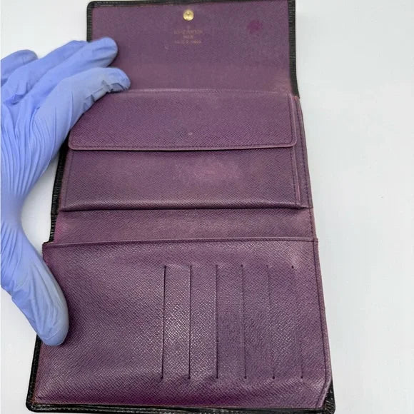 Interior features water resistant leather and engraved LV logo. Beautiful purple interior features 6 card slots, 3 bill compartments, 1 button coin compartment.