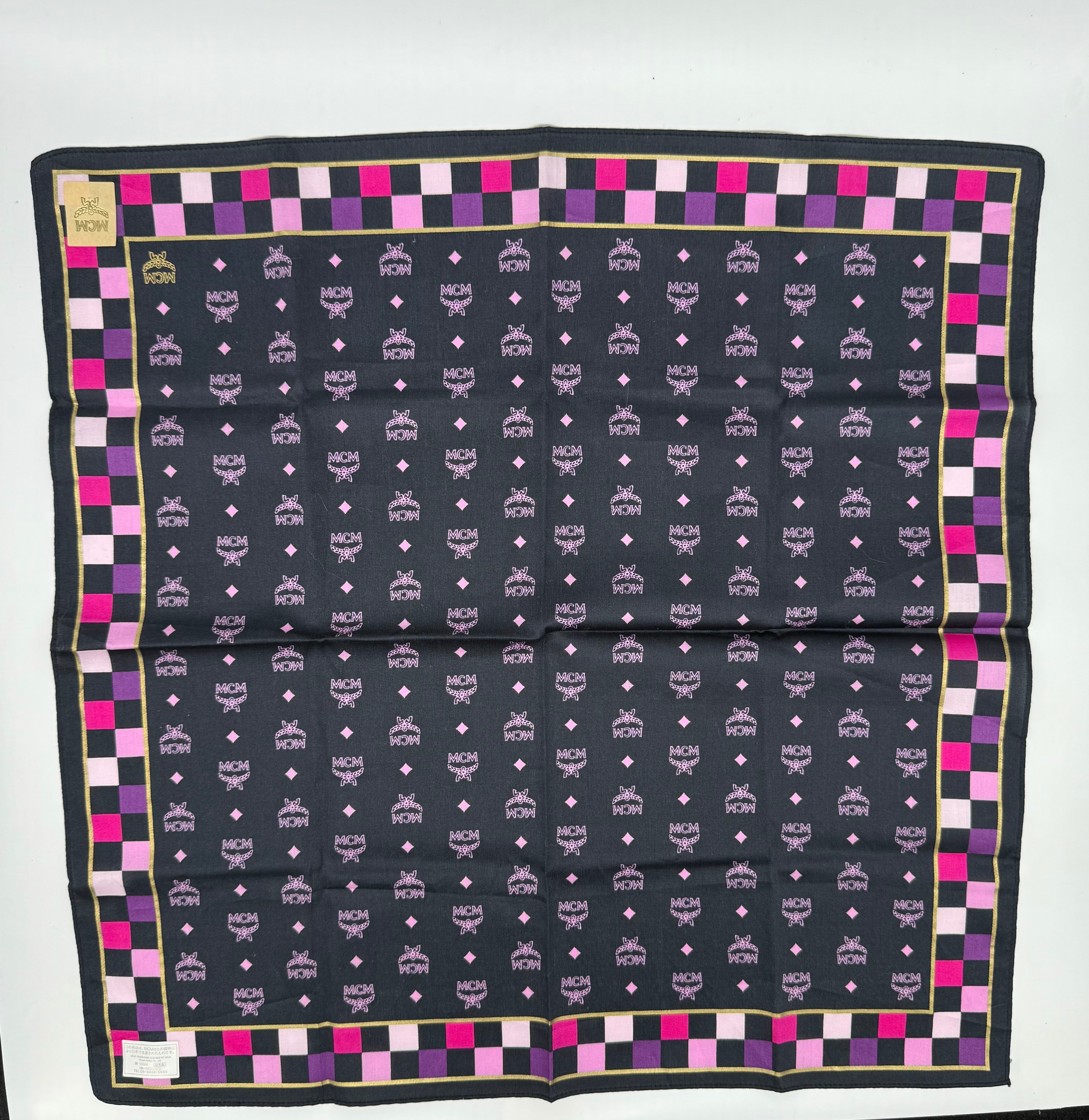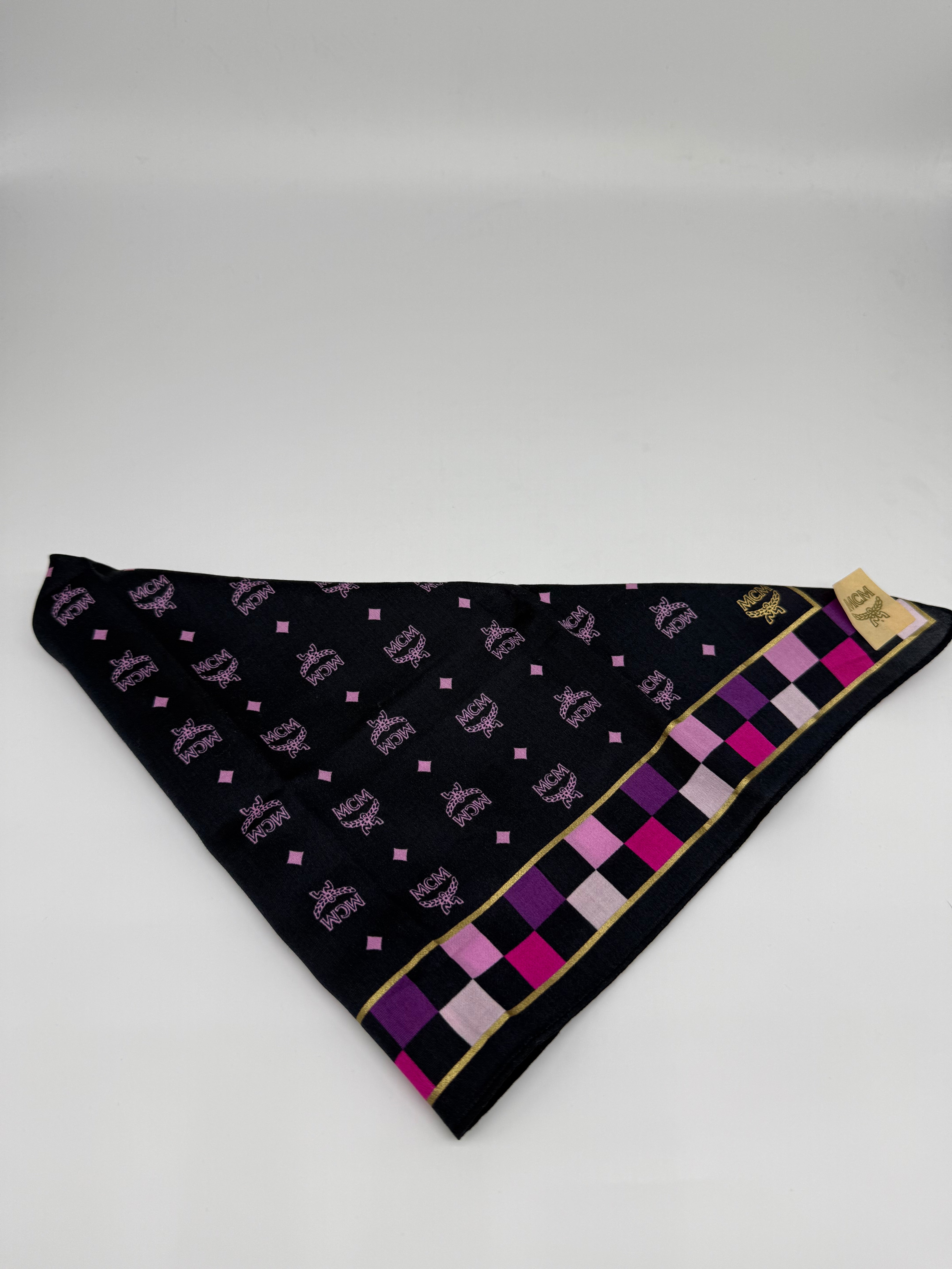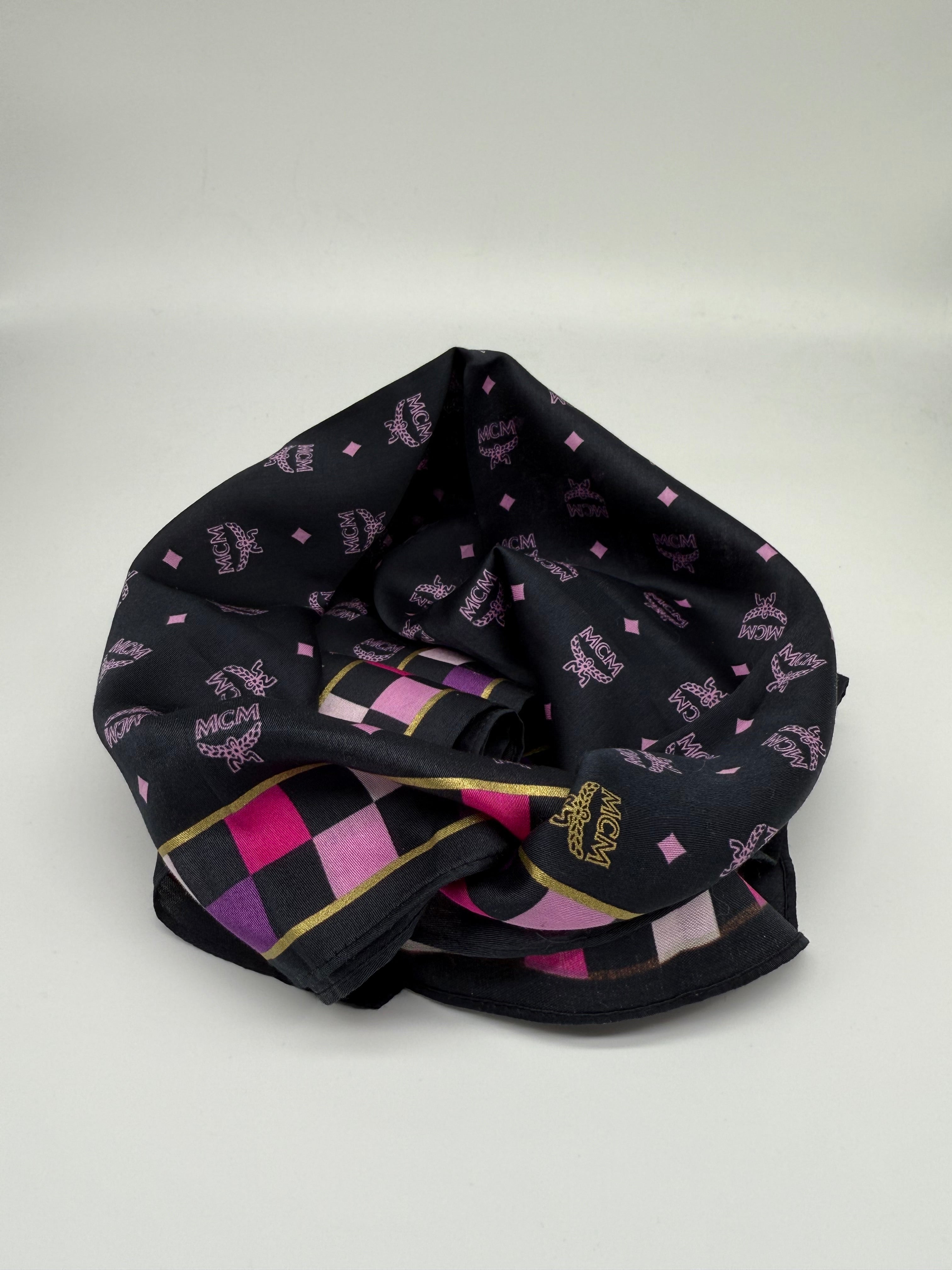 This rare vintage MCM scarf is a striking accessory crafted from 100% silk, featuring the brand’s iconic Visetos monogram in soft pink on a deep blue background.