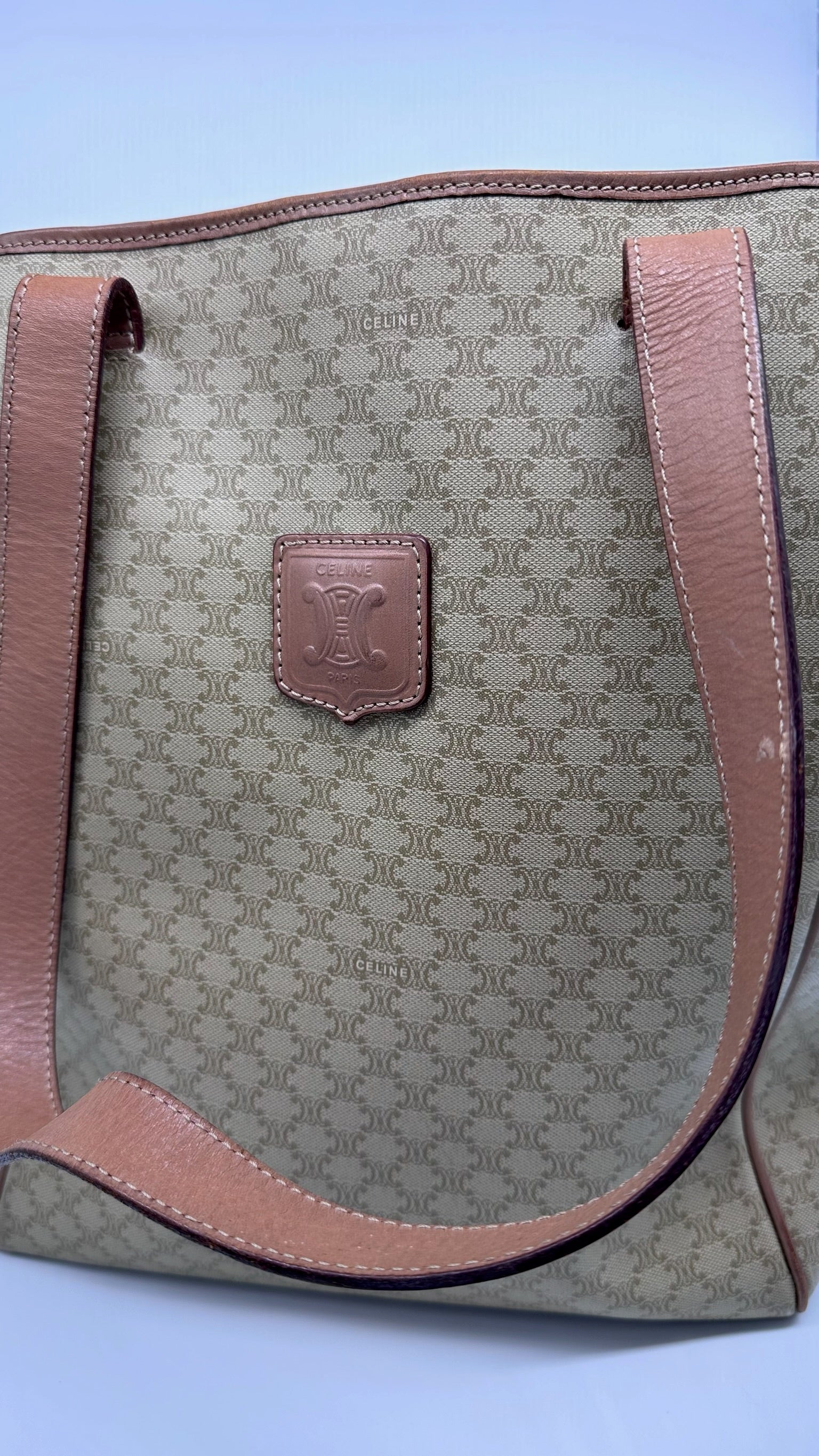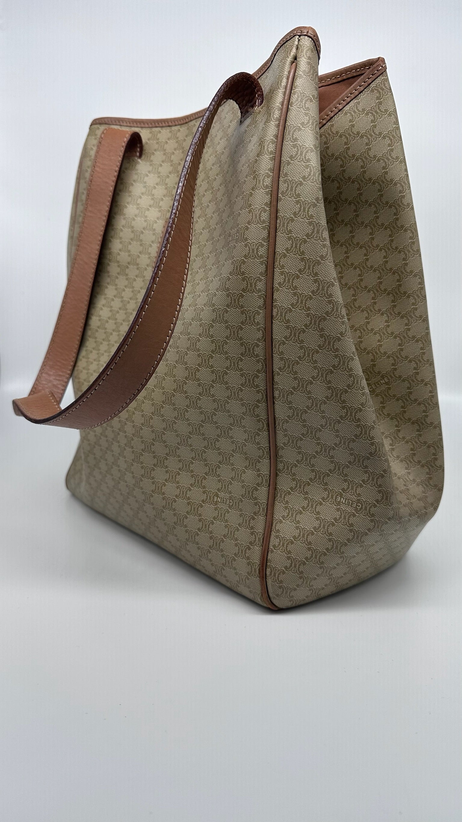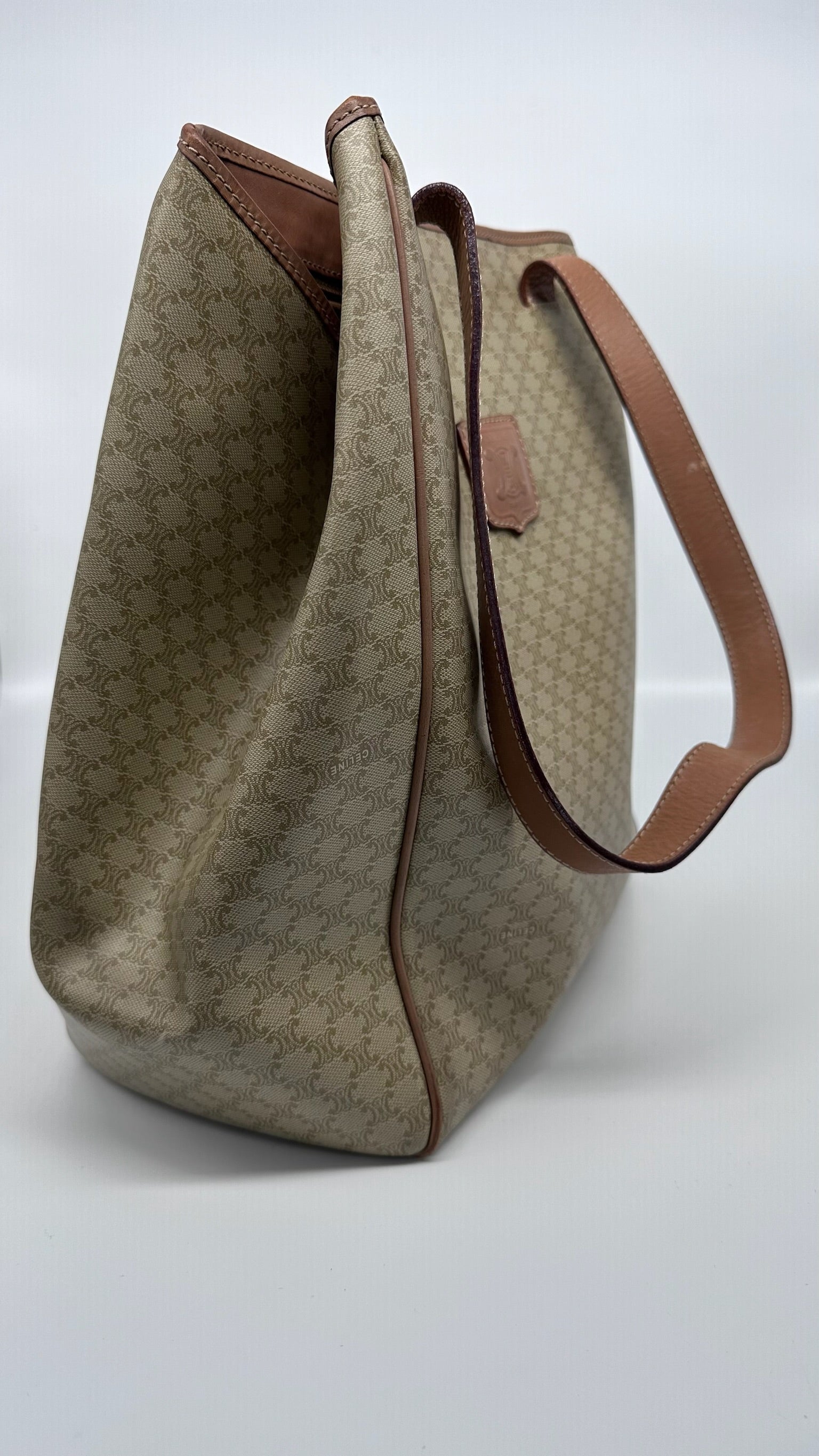 Authentic vintage Celine Macadam tote bag featuring the classic Triomphe monogram canvas in beige with rich brown leather trim and long shoulder straps.