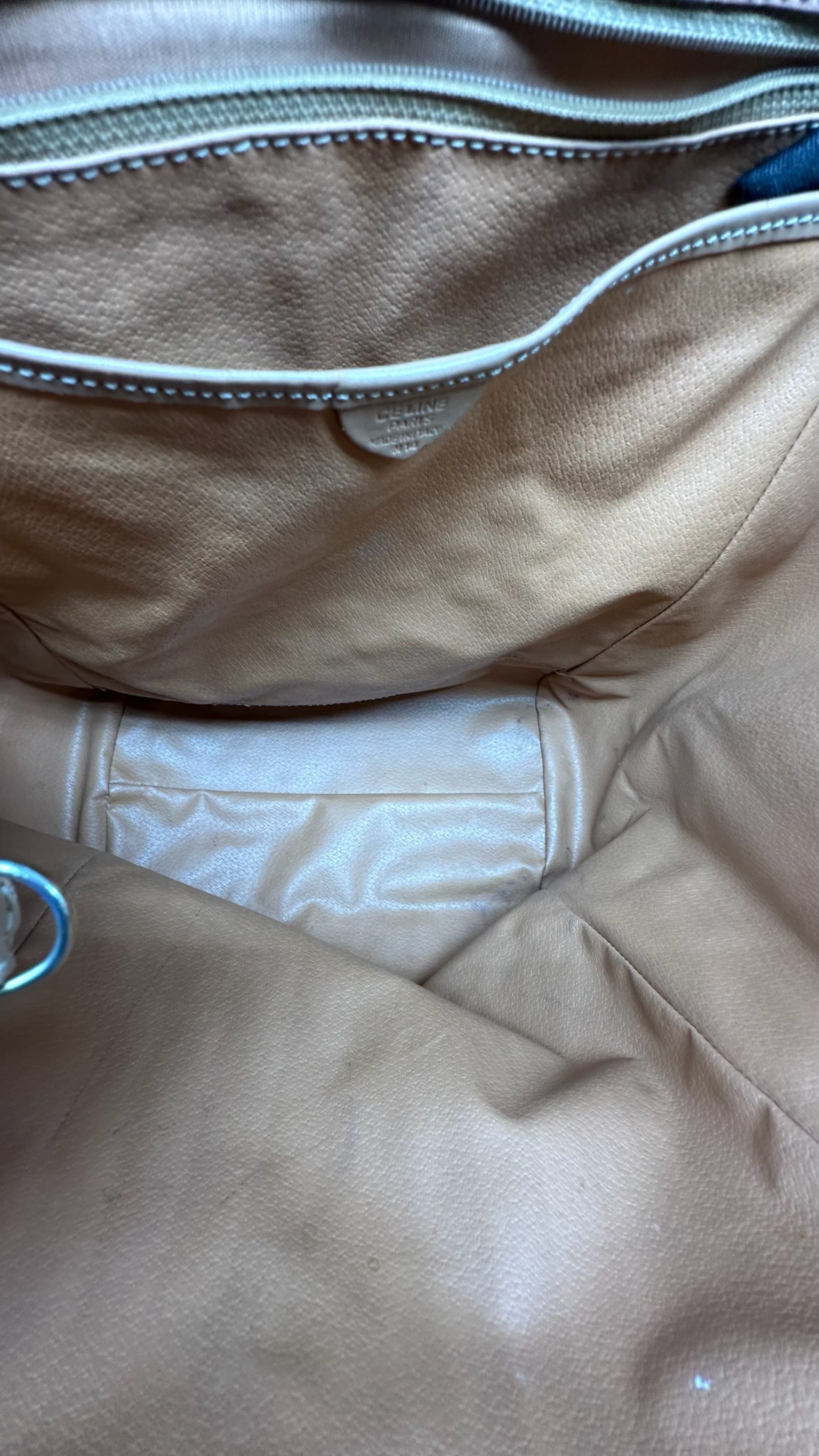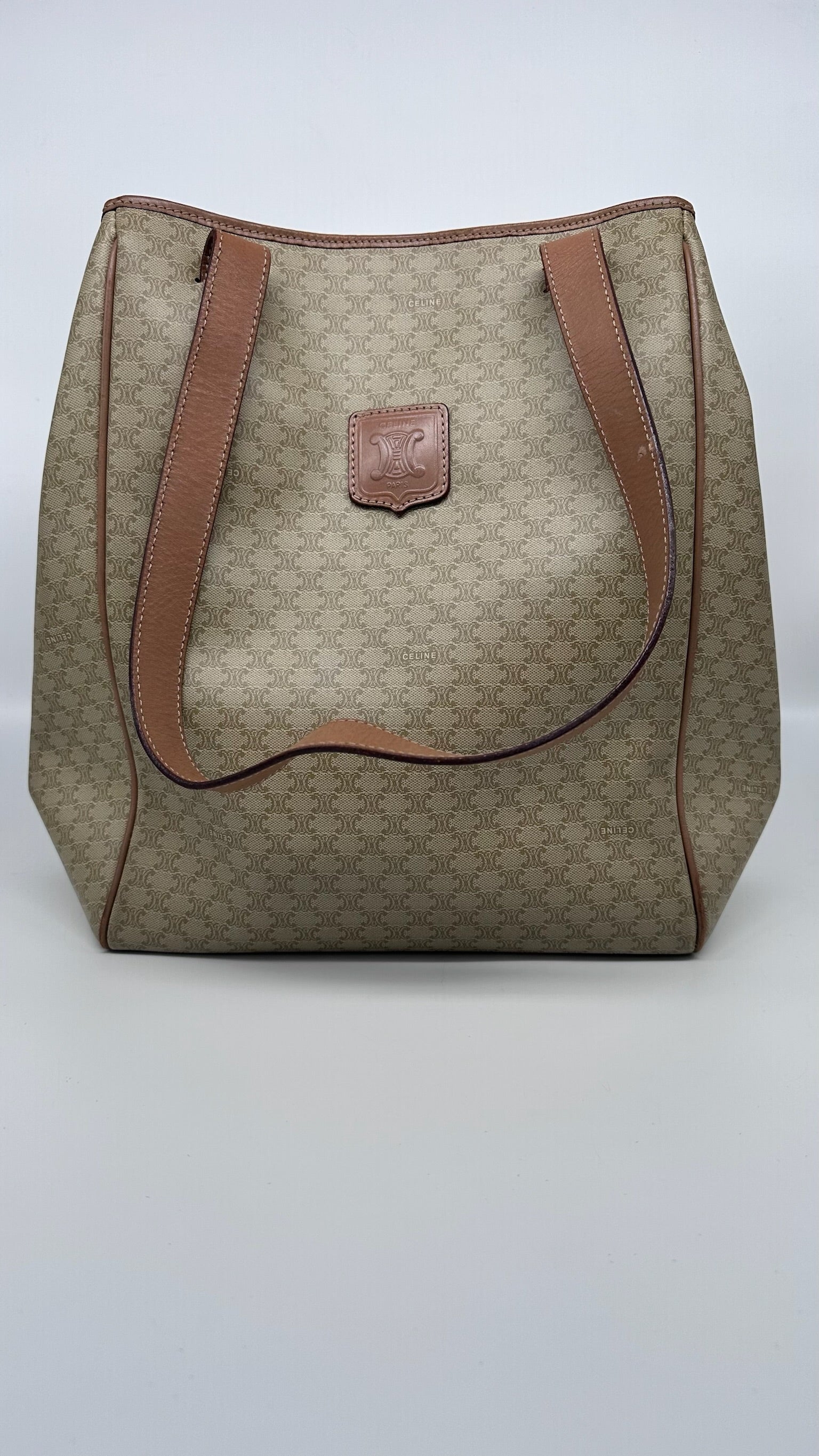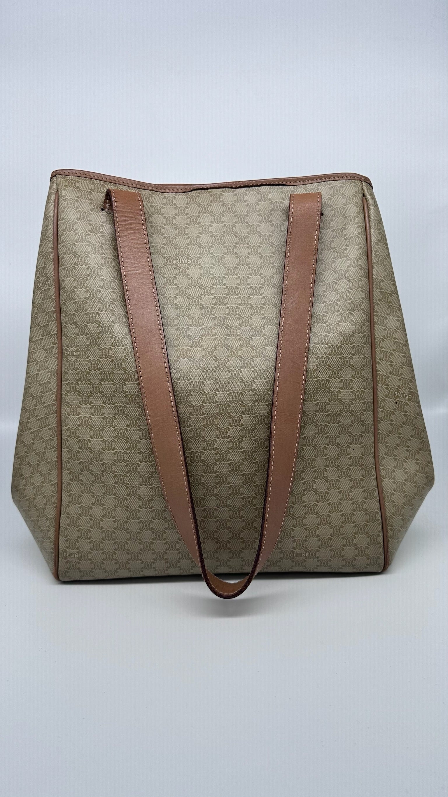 Authentic vintage Celine Macadam tote bag featuring the classic Triomphe monogram canvas in beige with rich brown leather trim and long shoulder straps.